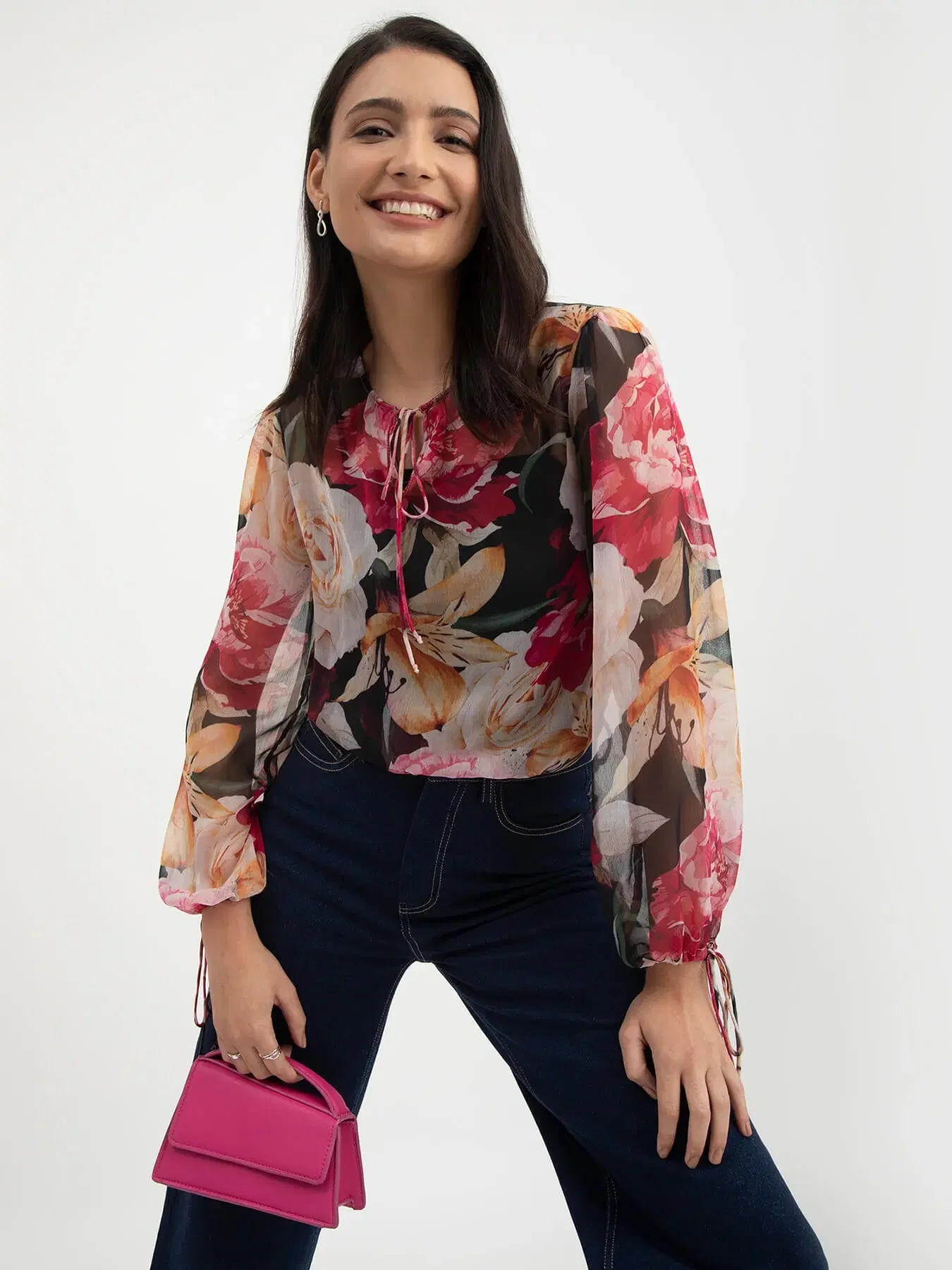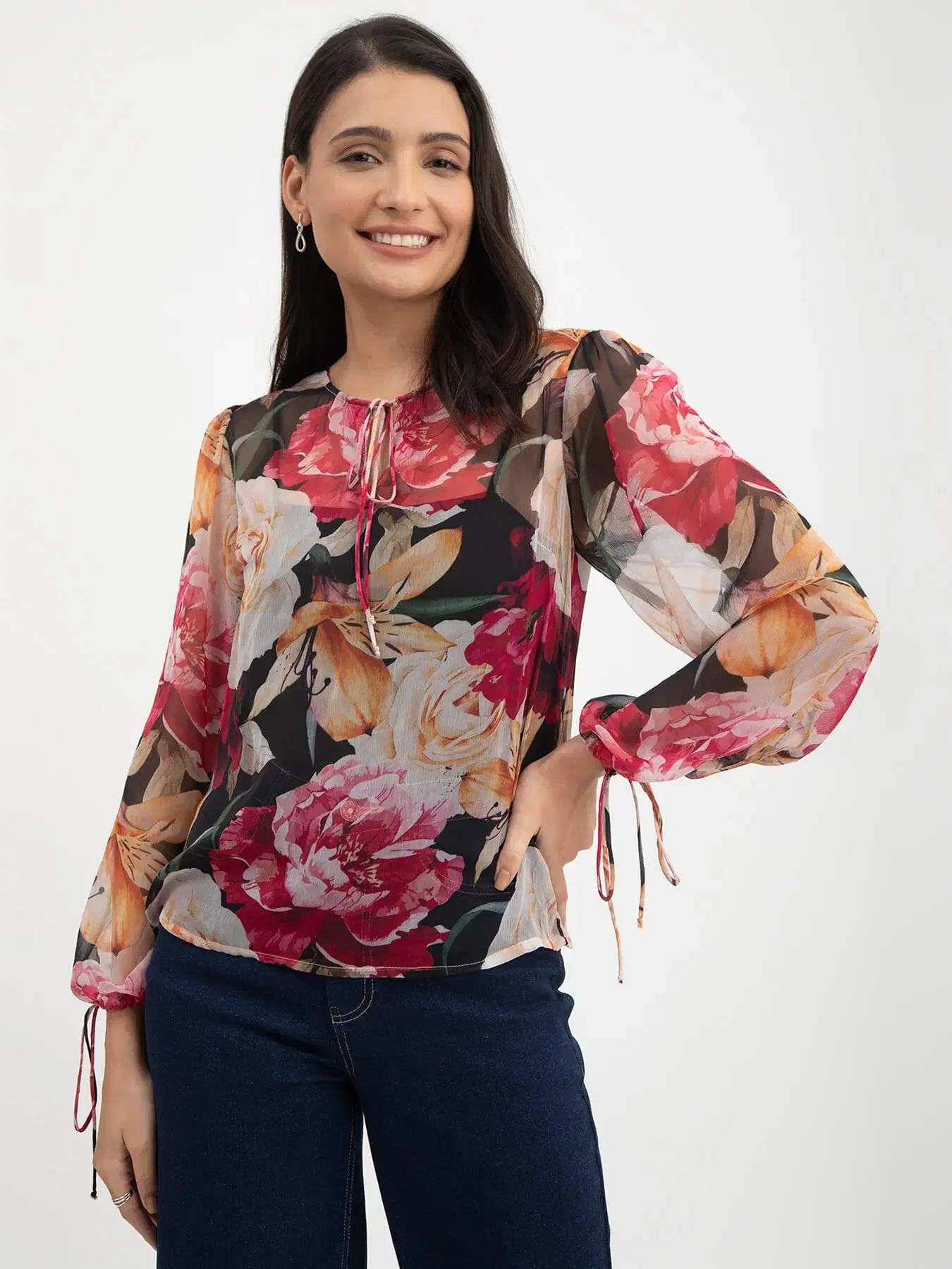 Floral Print Tie-Up Top - Black and Multicolour